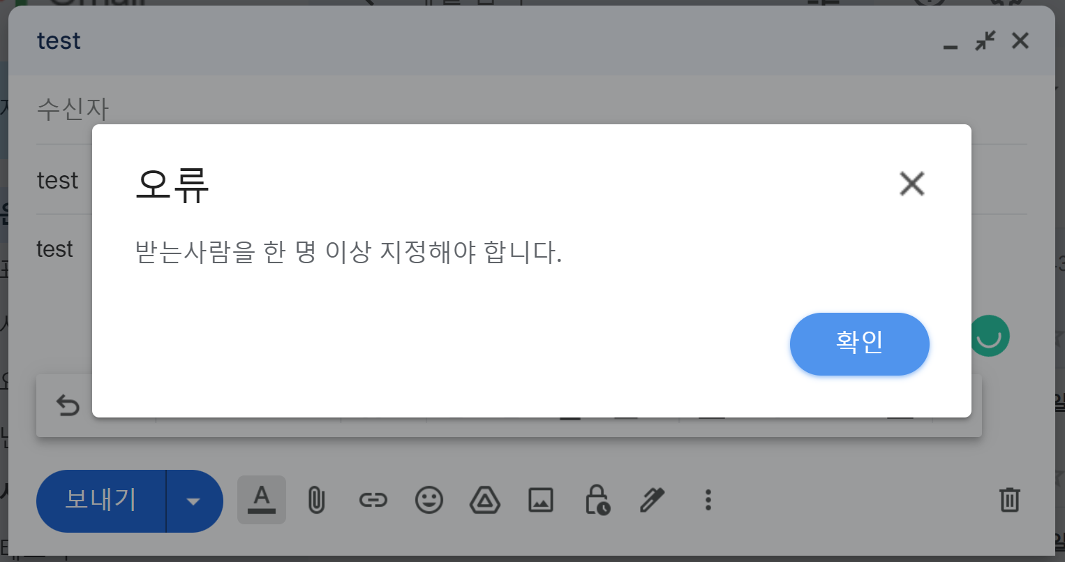 예시 : Gmail 수신자를 깜빡하고 "보내기" 버튼만 눌렀을 때, 오류 메시지를 띄워 받는 사람을 지정하라고 안내해준다. 오류방지 - gmail