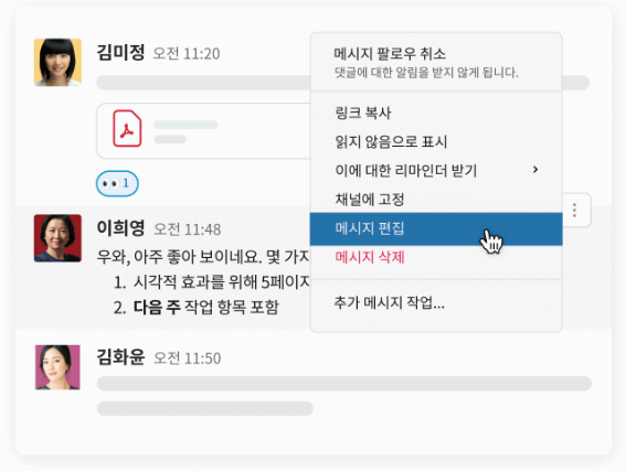 예시 : 슬랙(slack) 이미 보낸 메시지를 편집, 삭제 할 수 있는 기능 사용자 통제와 자유 - slack