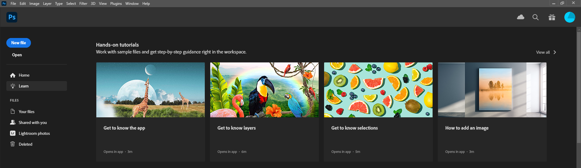 예시 : photoshop 포토샵 첫 화면을 열면, 초보자를 위한 상세 가이드와 새로 도입된 신기능에 대해서 설명해 주며, 다양한 프리셋과 단축키를 제공한다. 사용의 유연성과 효율성 - 포토샵