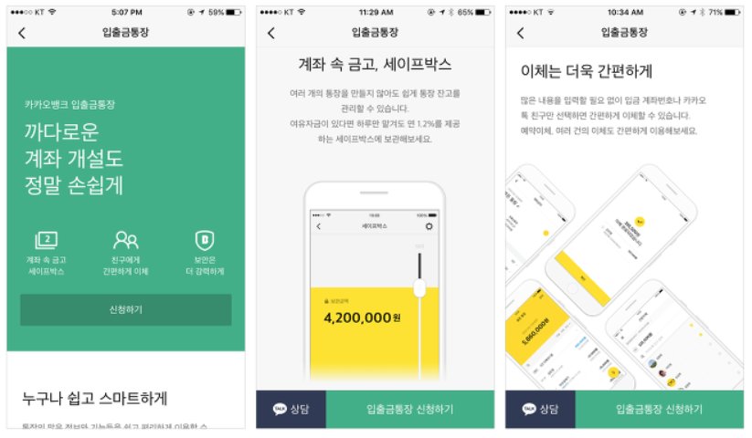 예시 : 카카오뱅크 기존 복잡해 보이는 은행 상품과 달리 기능을 한눈에 파악할 수 있는 이미지와 특징을 요약한 슬로건으로 금융 상품 이해를 돕는다 심미적이고 최소화한 디자인 - 카카오 뱅크